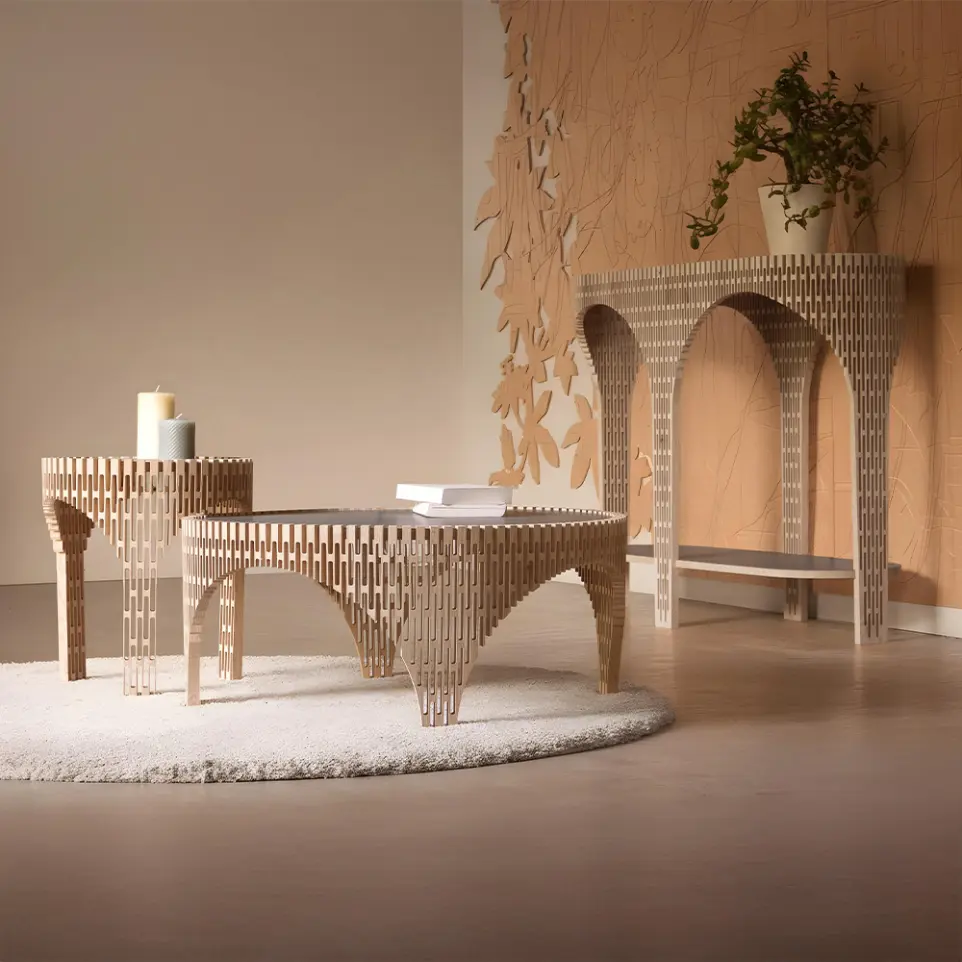 La console repose sur un piétement en chêne massif clair de Franche-Comté, façonné selon le savoir-faire exclusif d’Ibride. Les arcatures ajourées qui enveloppent les plateaux sont découpées et gravées dans nos ateliers à Besançon, conférant au bois une souplesse visuelle tout en conservant sa solidité.