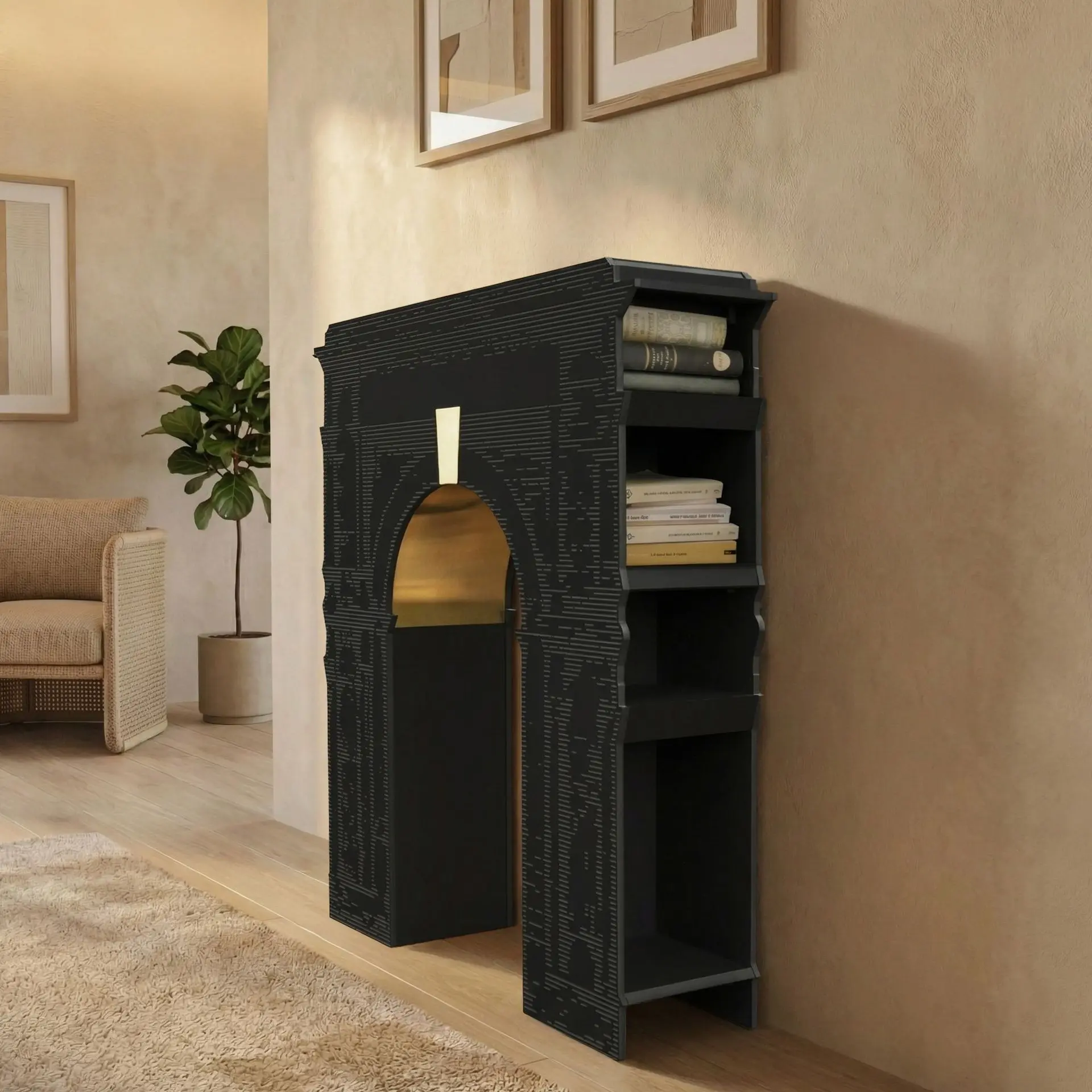 Ce meuble murale se distingue par sa façade partiellement gravée évoquant l'usure de la pierre. Les côtés ouverts de cette console permettent de ranger des livres et objets personnels, tandis que deux compartiments secrets offrent un espace discret pour les bijoux et autres trésors.